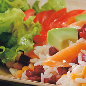 Lechuga, tomate, cebolla, atún, aguacate, remolacha, h. duro, patata asada, arroz, mango, manzana