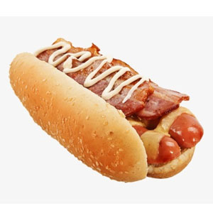 Salchicha blanca, queso, bacon, cebolla crispy, mayonesa